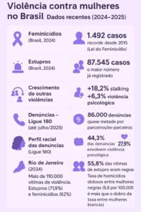 No Rio de Janeiro, o cenário não é diferente. O Dossiê Mulher 2024, do Instituto de Segurança Pública (ISP-RJ), mostra que mais de 110 mil mulheres foram vítimas de violência no estado. Quase três em cada quatro estupros e mais da metade dos feminicídios ocorreram dentro da residência das vítimas. A desigualdade racial também aparece de forma contundente: mulheres negras seguem sendo as principais vítimas.
