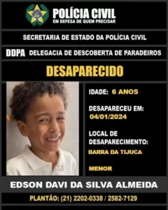 Edson Davi Silva desapareceu na última quinta-feira (04/01), na altura do Posto 4, na Praia da Barra da Tijuca. O pai do menino é dono de uma barra no local e estava trabalhando, quando o filho sumiu. Desde então, os Bombeiros fazem buscas utilizando um helicóptero, drones e motos aquáticas.