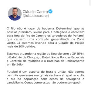 O governador do Rio de Janeiro, Cláudio Castro (PL), se pronunciou na tarde desta quarta-feira (23/10) sobre a confusão generalizada causada por torcedores do Peñarol, na zona oeste do Rio, e prometeu expulsar todos os vândalos do estado.