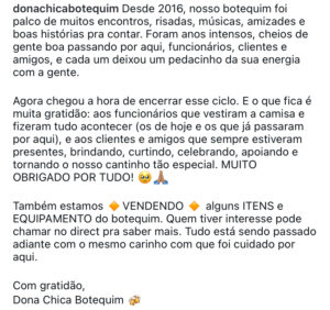 Além da despedida, os donos informaram que estão vendendo itens e equipamentos do botequim e convidaram interessados a entrarem em contato por mensagem direta.