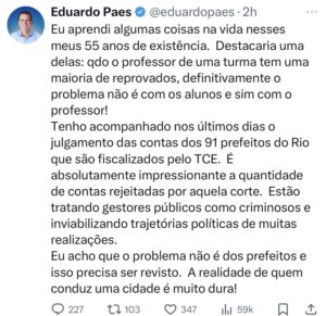 Em publicação nas redes sociais, Paes afirmou que, assim como em uma turma com alto índice de reprovação o problema pode estar no professor, e não nos alunos, o mesmo raciocínio pode ser aplicado aos gestores municipais.