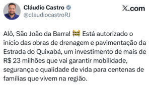 O governador Cláudio Castro (PL) anunciou nesta terça-feira (2), pelas redes sociais, a autorização para o início das obras de drenagem e pavimentação da Estrada de Quixaba, no 5° Distrito de São João da Barra, no Norte Fluminense. O investimento é de mais de R$ 23 milhões.