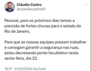 O governador Cláudio Castro (PL) decretou ponto facultativo em todo o estado do Rio de Janeiro, nesta sexta-feira (22/03), em função das fortes chuvas previstas para os próximos dias.