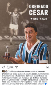O Grêmio Foot-Ball Porto Alegrense confirmou na tarde desta terça-feira (17/09), a morte de César Martins de Oliveira, aos 68 anos.