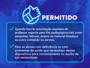 Quando houver autorização expressa do professor regente para fins pedagógicos, tais como pesquisas, leituras, acesso ao material Rioeduca, outro conteúdo ou serviço.