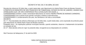 A decisão, publicada no Diário Oficial do município, também determina o hasteamento das bandeiras em posição de luto nas repartições públicas. O decreto ainda ressalta o “consternamento dos pais, dos familiares e de toda a comunidade”.