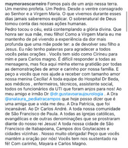 Além de Pedro, Mayara e Carlos Magno também são pais da pequena Cecília. “Peço que vocês nos ajudem a receber com tamanho amor nossa menina Cecília!”, finalizou a mãe, ainda em meio à dor da perda, mas envolvida por uma rede de afeto e espiritualidade.